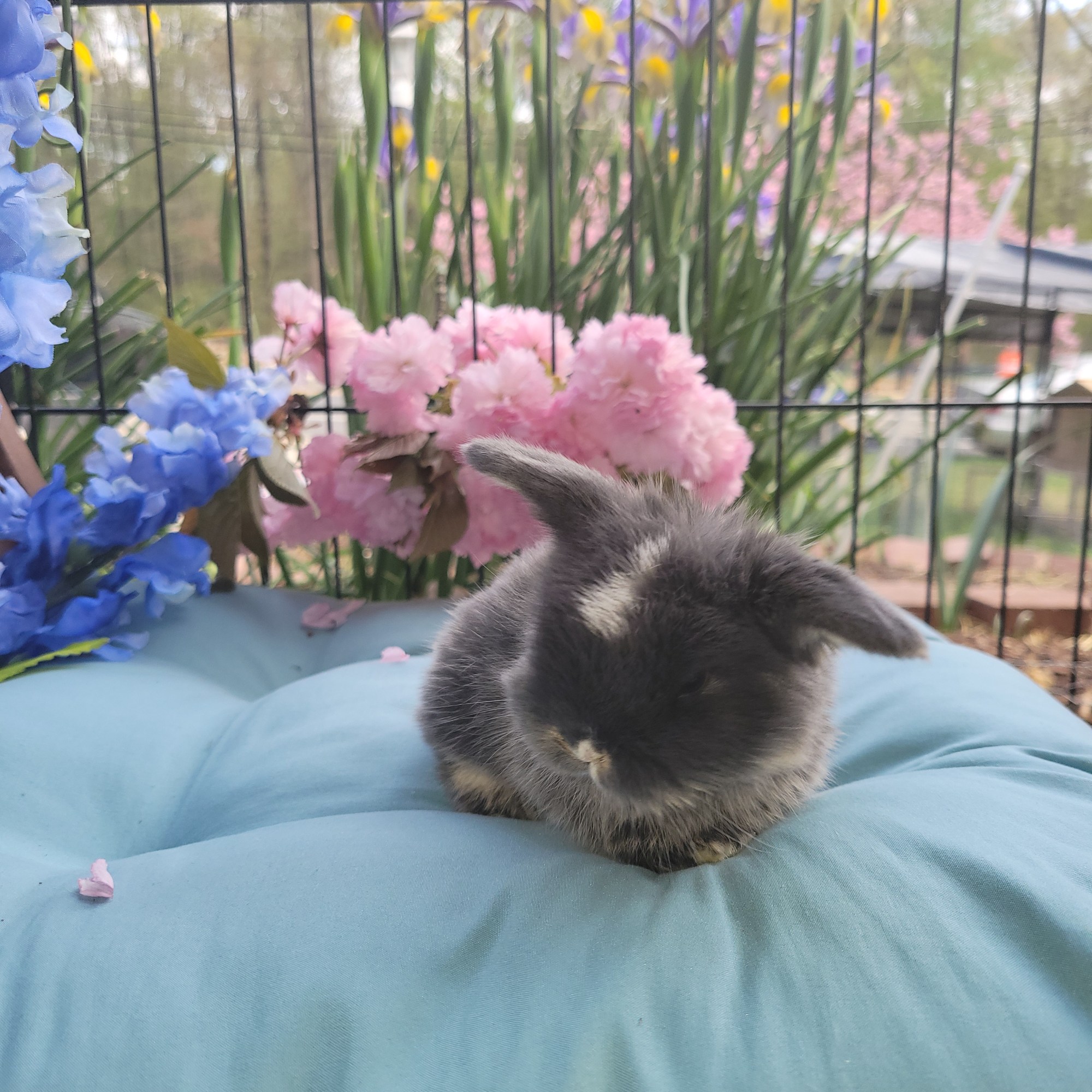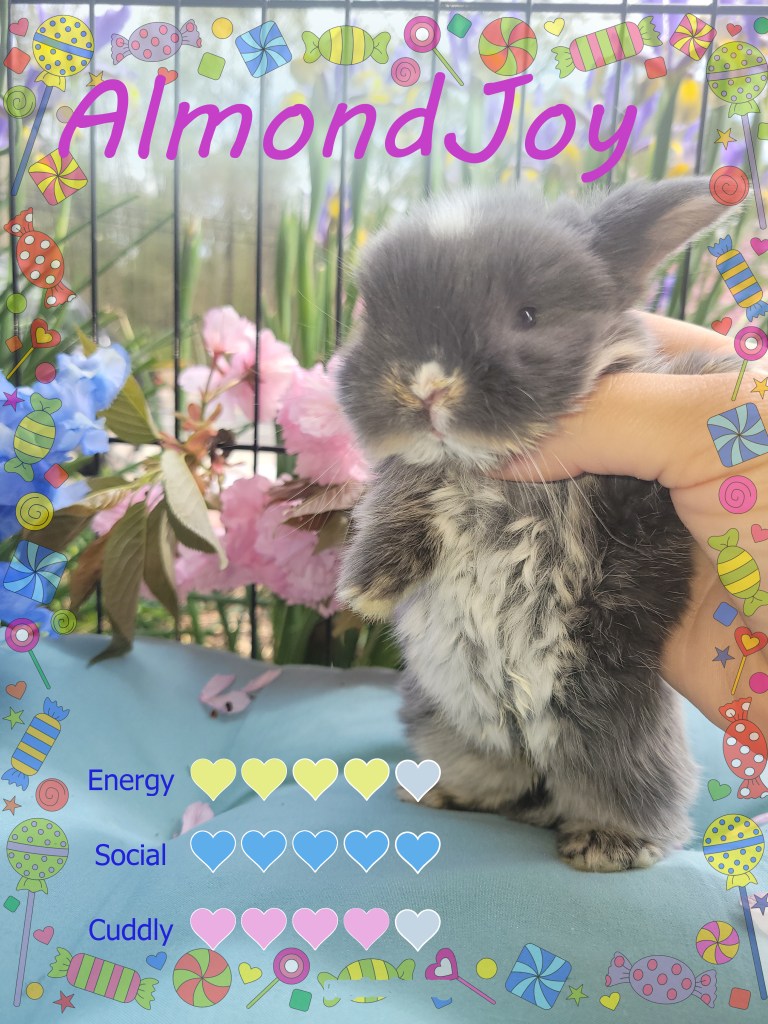4-28-21: In every large litter there is a runt, and Almond was the runt of DJ’s litter. I had to bottle feed her to keep her caught up with her littler mates. Most baby bunnies that are hand raised end up having an extra special attachment to people. Like a child she jumps into my lap and expects nourishment and love, she’s very easy to handle and probably one of my favorites this litter.