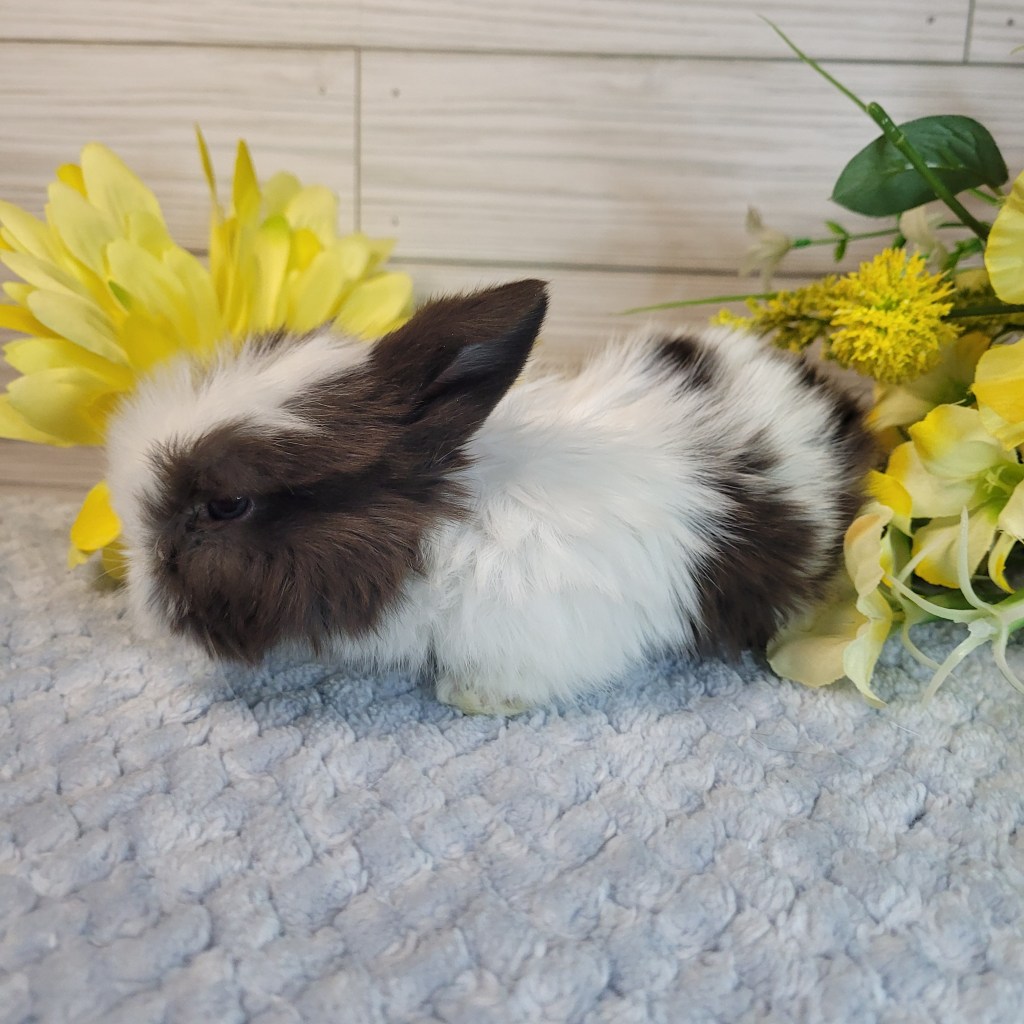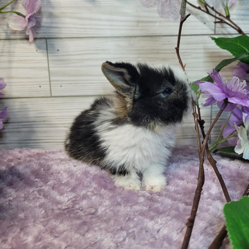 Nova: RESERVED Our beautiful black star of a bunny with very unique patterning and bright blue eyes. She has lots of personality and we call her our little crazy girl! She can be bossy and attention hungry! $800 Born Feb 6th set to go home March 27th.