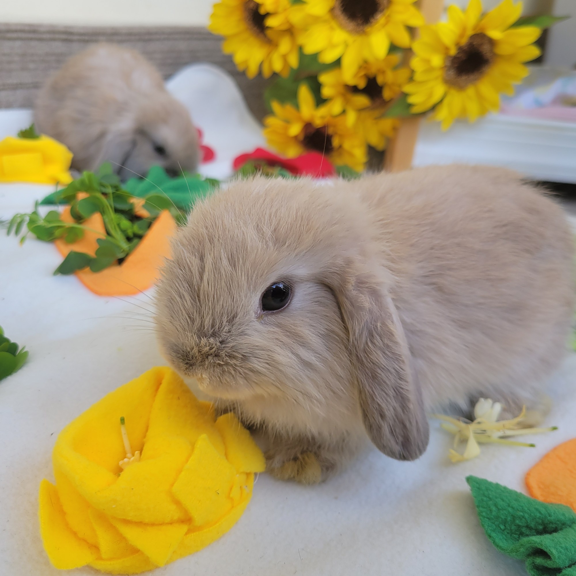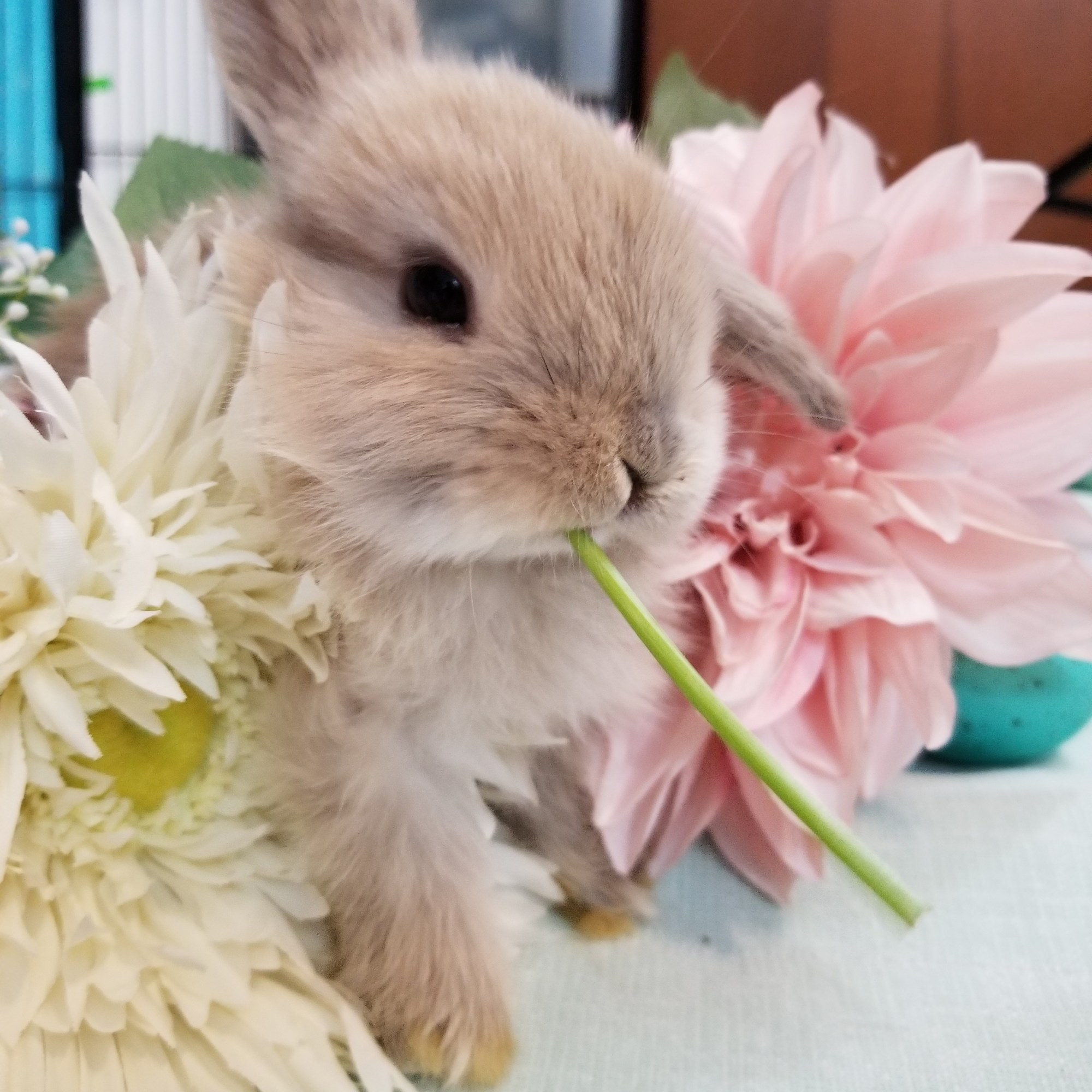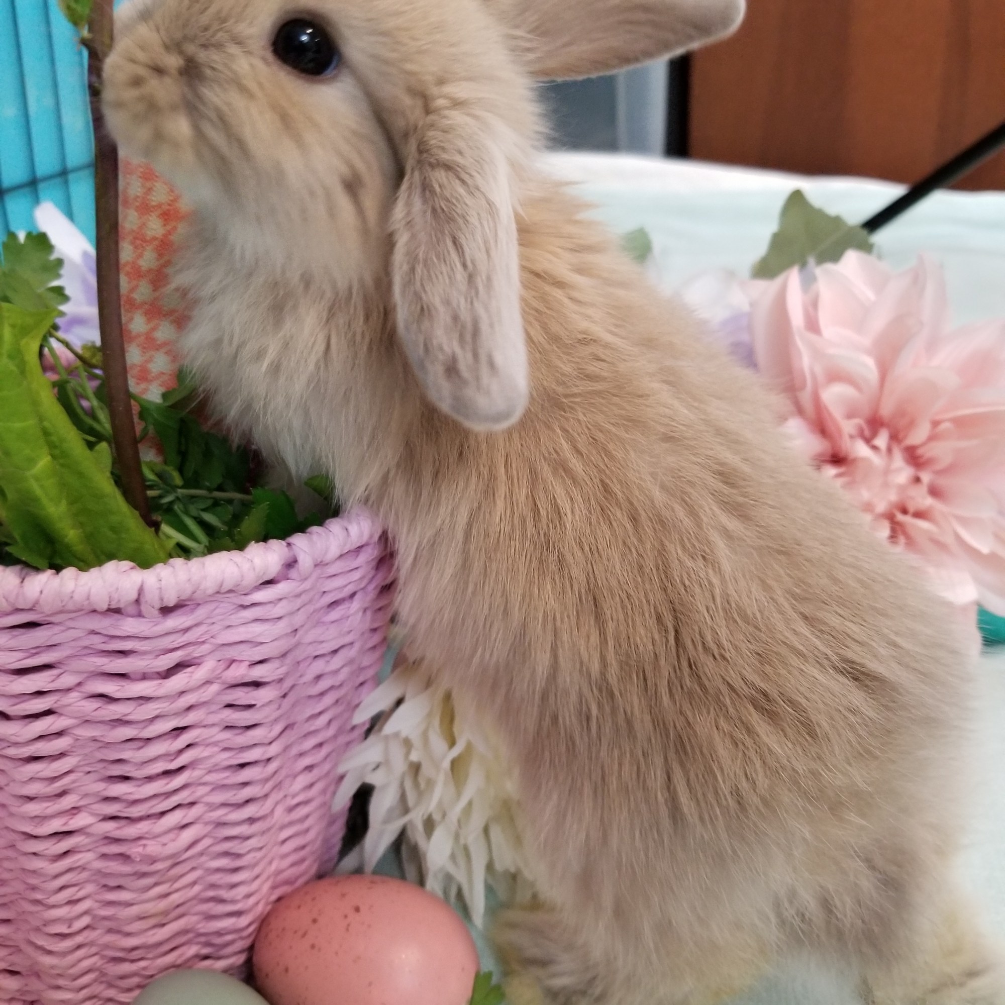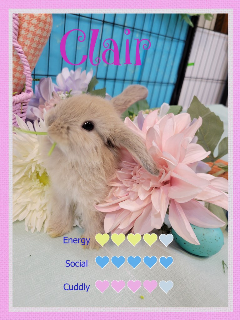 5-29-21: Clair is a sweet and gentle girl. She spends a good deal of her time investing what people in the house are doing. She’s a cute and a nosey little bunny, I often find her following me as I walk across the living room. And she’s the first bunny to follow me outside the front door, which tells me she is very trusting of her care givers. Very friendly, likes to hop into your lap when you sit down. I like that she is not overly needy and knows when to give you space.