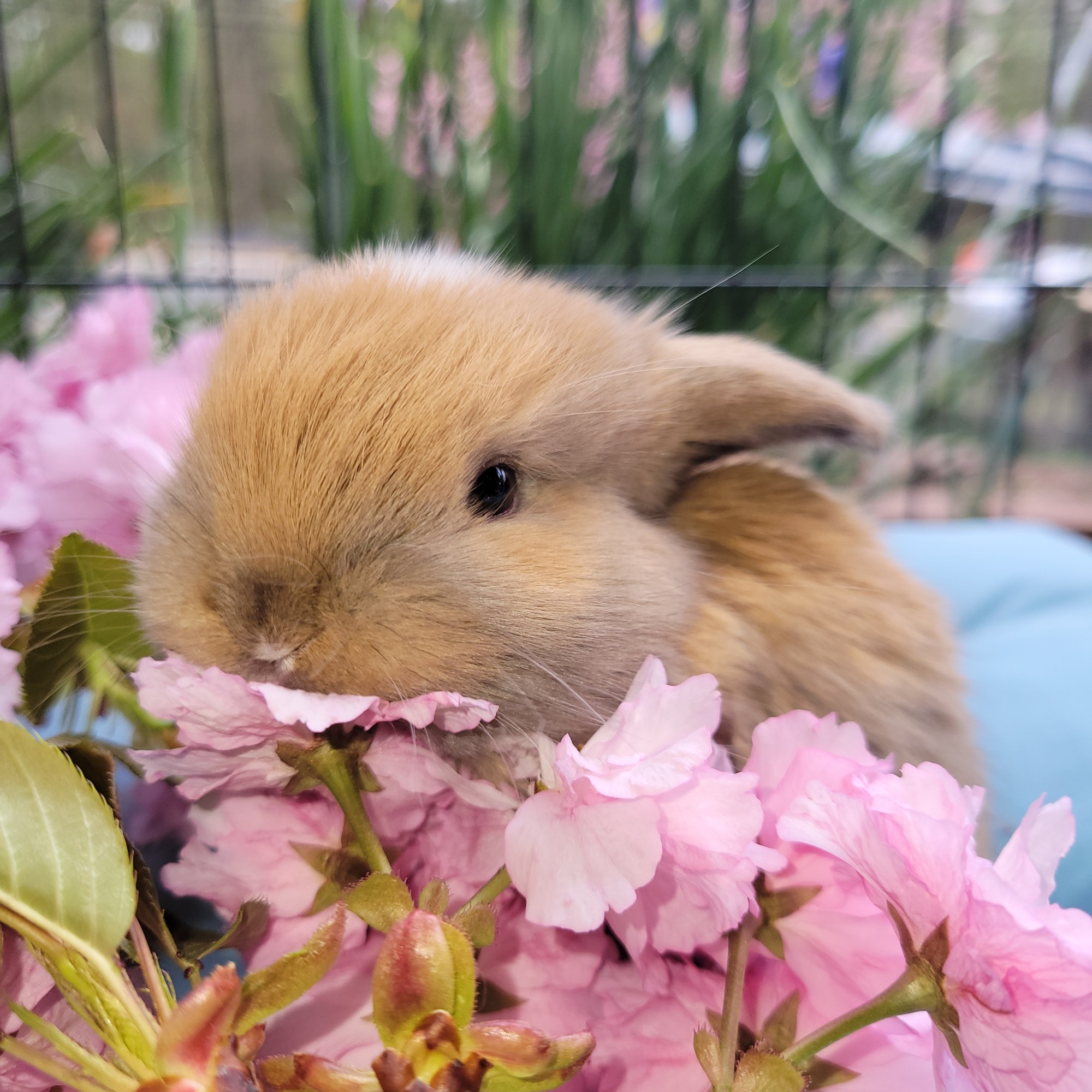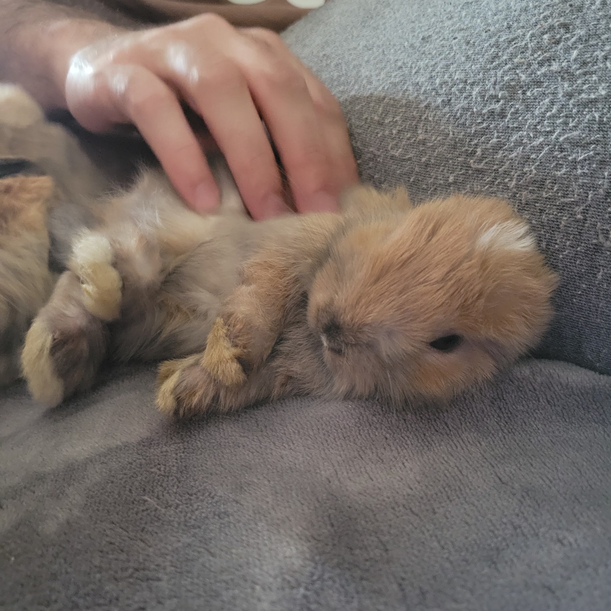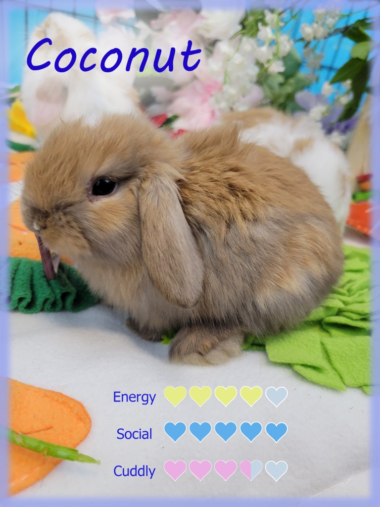 4-28-21: I always notice the first bunny to leave the safety of the nest. These bunnies always have the most outgoing personalities, they have a sense of adventure and are relatively fearless. Little Coconut is that bunny, at just 2 and a half weeks old he’d leave the safety of his nest box to spend time with the cuddle buns family in the living room. He has a great fondness for the company of people, rabbits and himself! He’s always one of the first ones who wake up in the morning and is eager to play outside. Often he is one of the last ones to go to sleep at night, he likes to stay up and watch some late night tv with us.