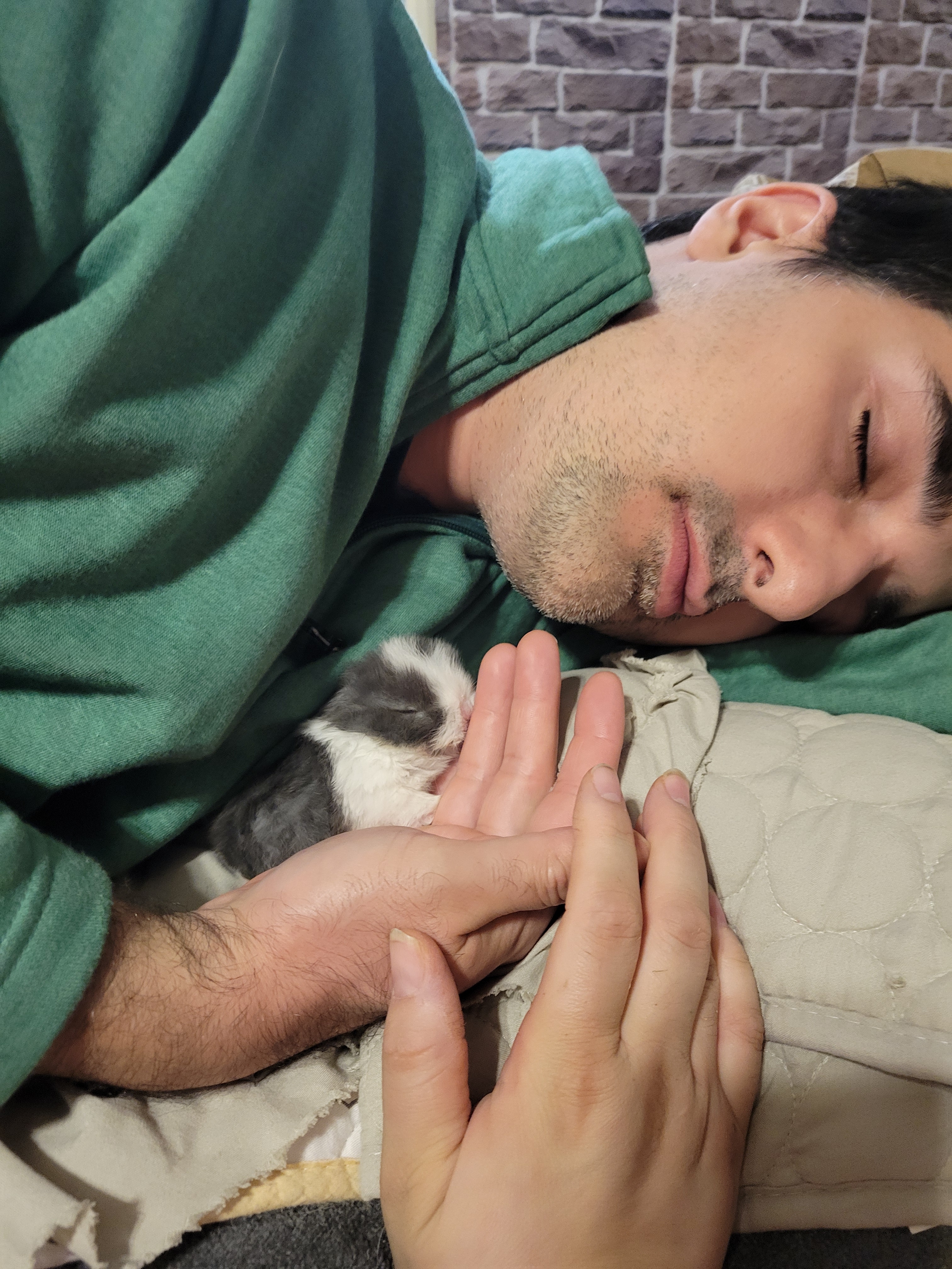 11-23-21: Litter Hercules has nearly passed his trials and we expect a full recovery from this little hero. Snuffles isn’t going to slow this little hero down. Like the energizer bunny he keeps going and going and going! He loves to explore, play, binky at any moment and he gets super excite about everything! He hates to be on the floor by himself and rather be snuggled up against your chest or closed up in your jacket. There are a few rare cases where baby bunnies become fully dependent on a human for their needs and I am absolutely flabbergasted by how he turned out. I often tell people my bunnies see humans as giant rabbits, but I think Hercules see’s himself as a tiny human.