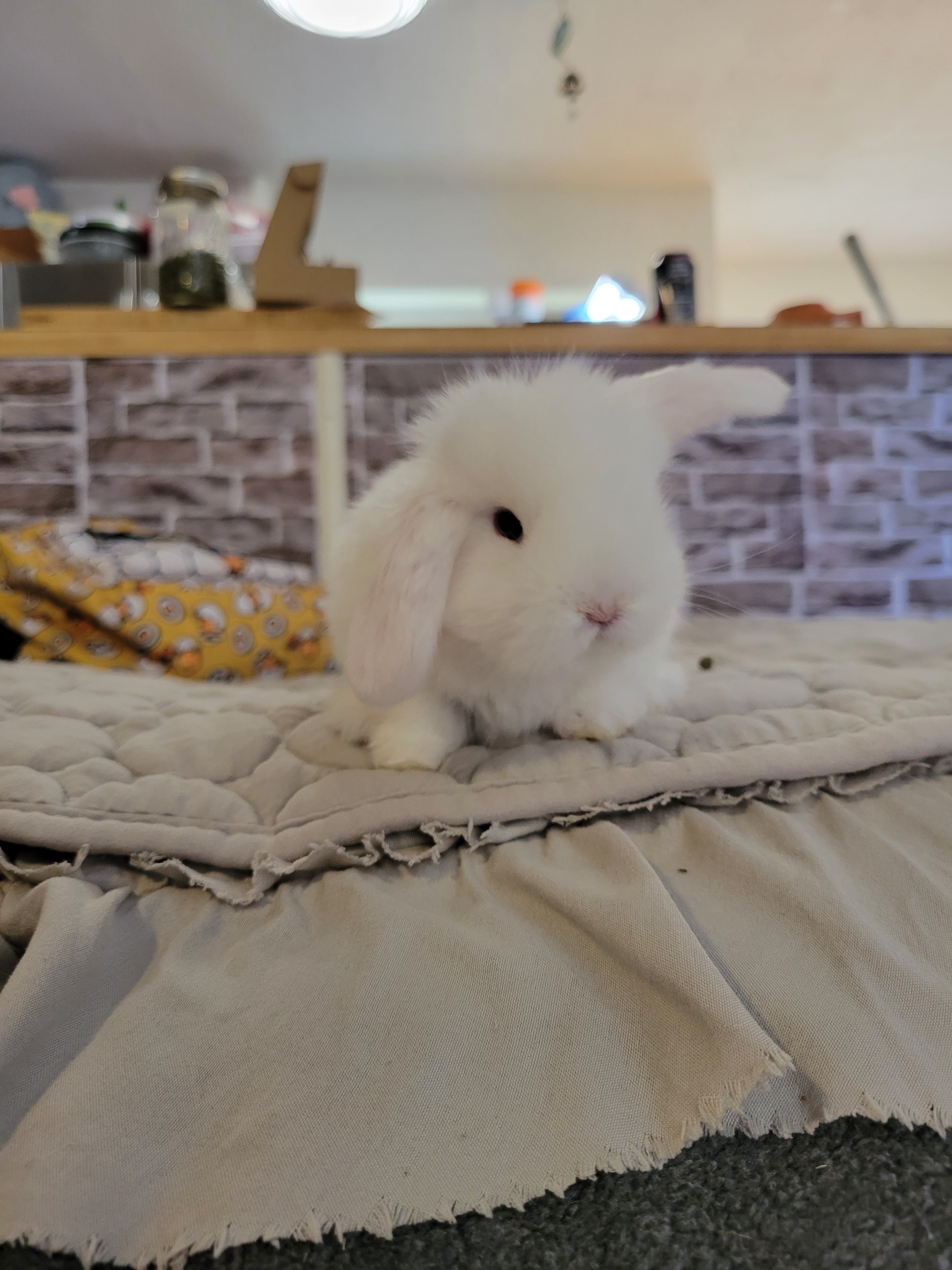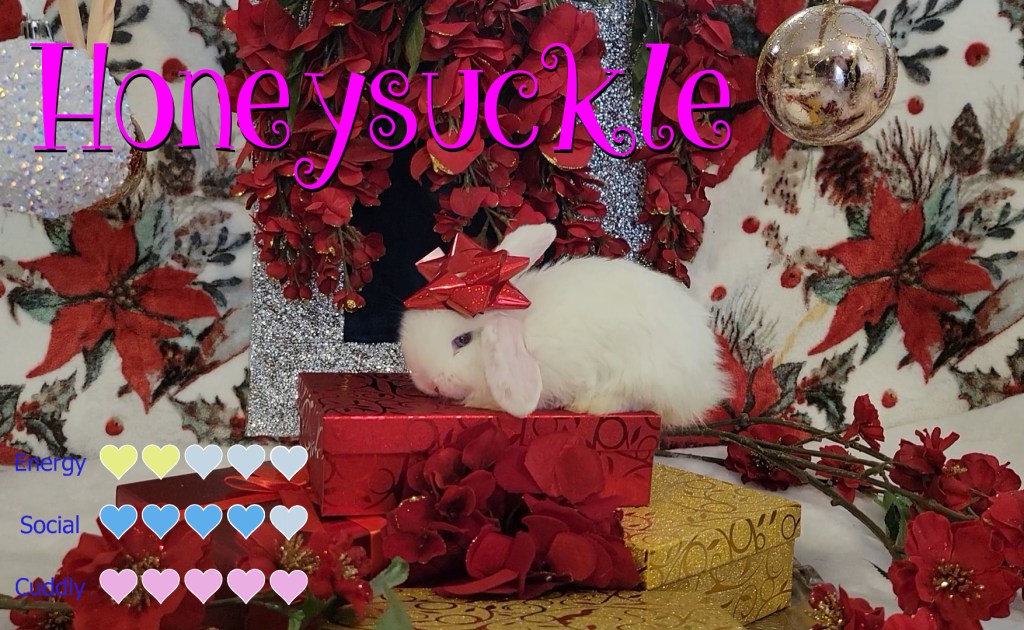 12-12-21: We used Honeysuckle to be a support and companion to Hercules. She did an amazing job and kept him company while we couldn’t, but as a result she caught his bunny cold about 2 weeks ago! She recovered naturally (without the help of antibiotics) and were happy to say she’s strong and ready to find her new home, though her release date was pushed back just to make sure her cold is gone. We love what a lap bunny she is, if you sit on the floor she’ll randomly just plop down in your lap. Her desire for closeness makes her a grade A cuddle bunny!