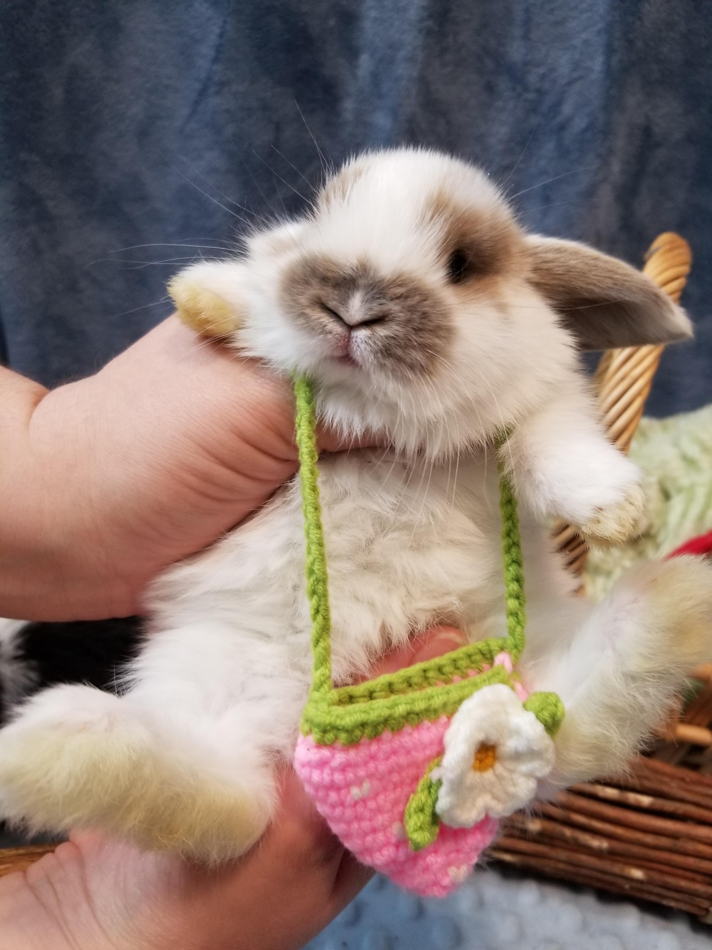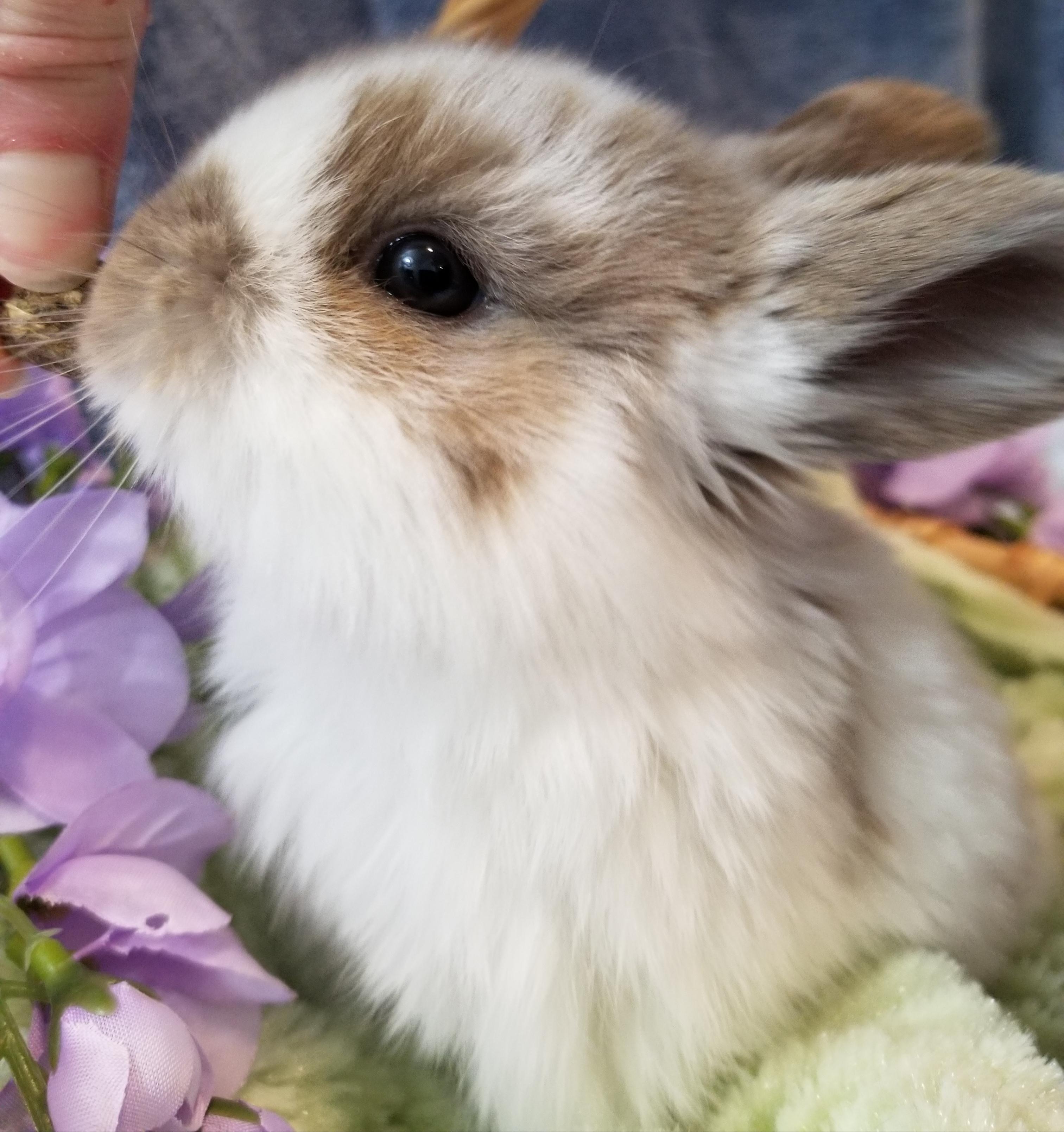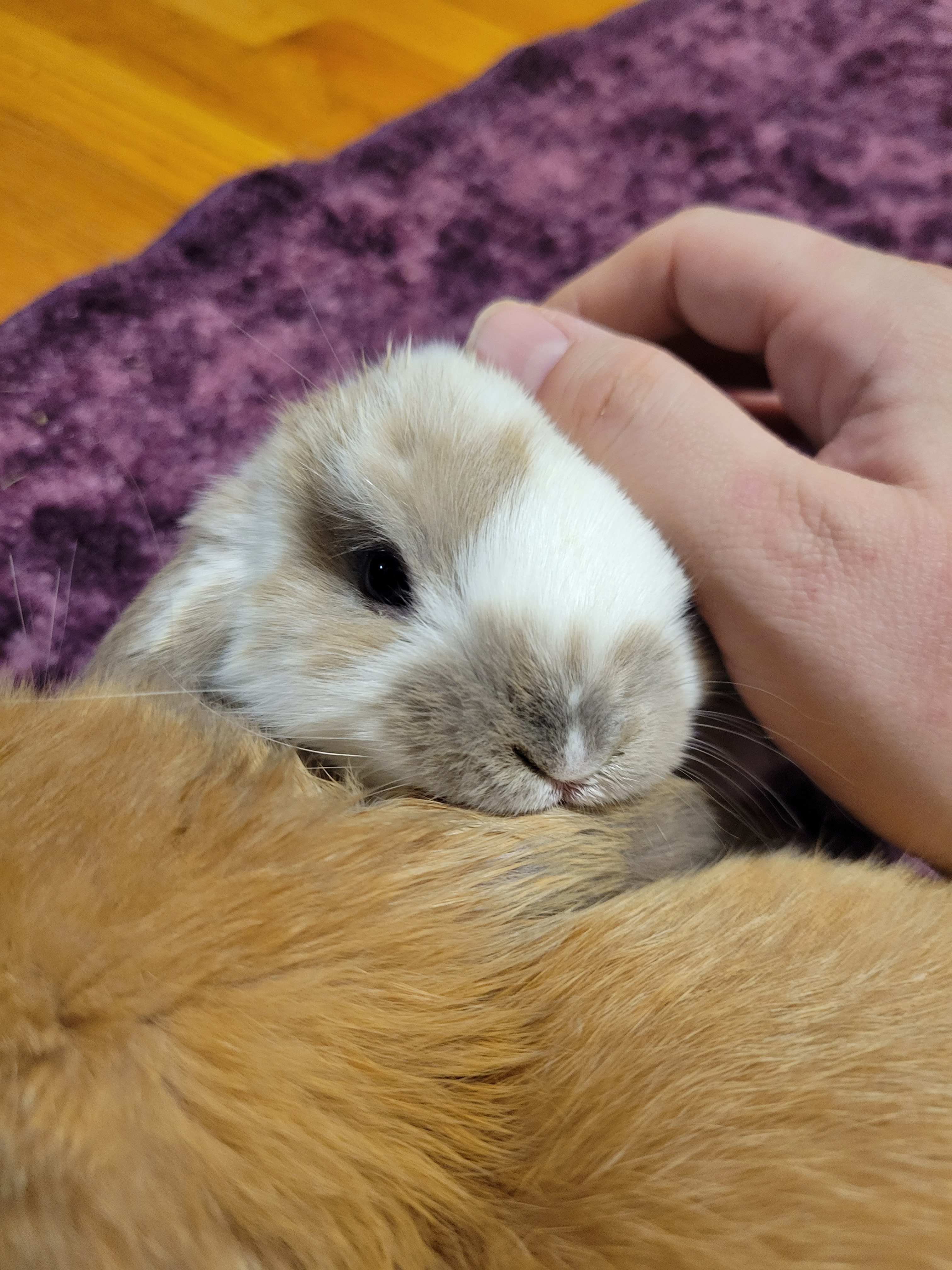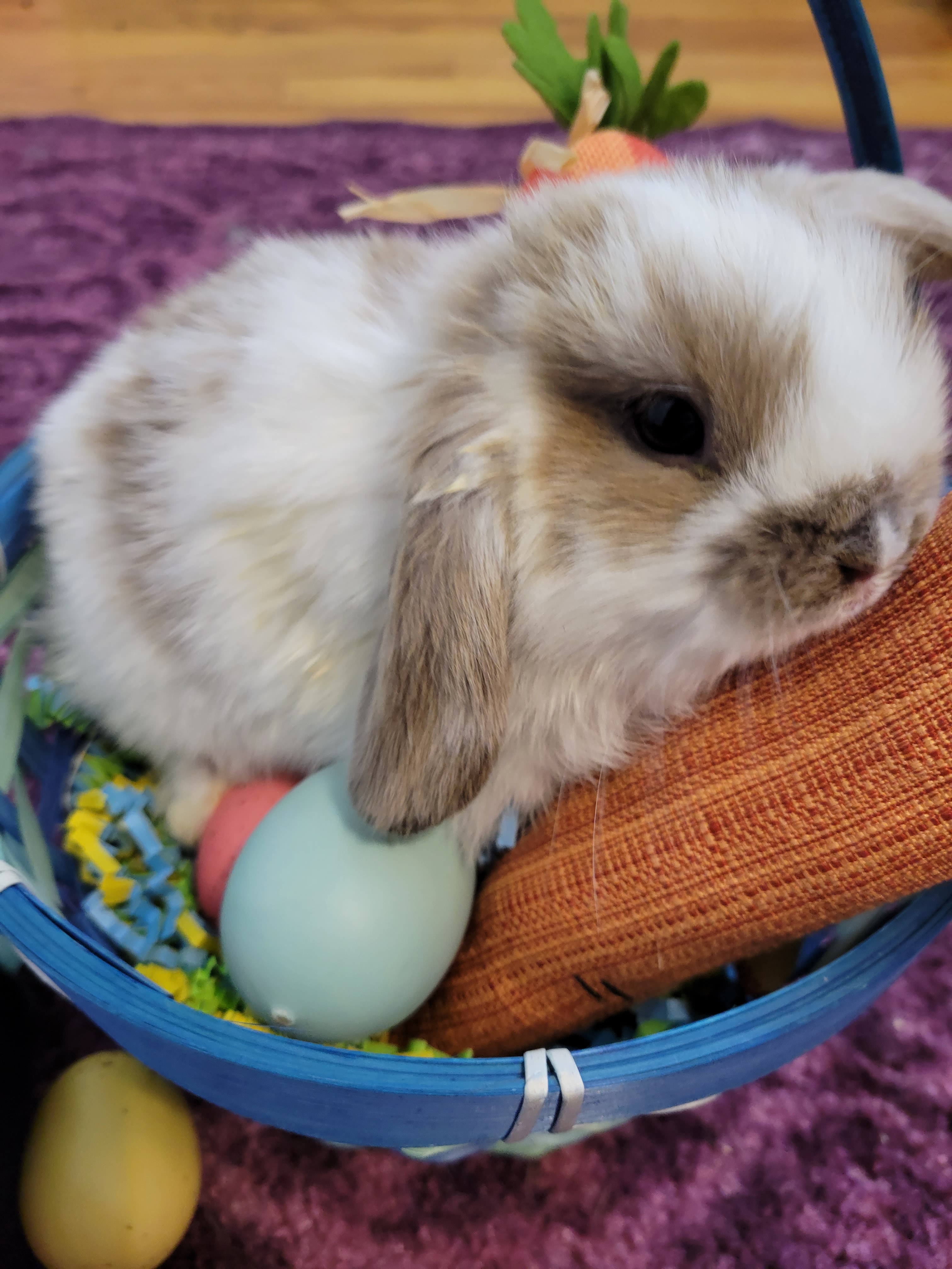 A little shy at first once he warms up to you, you’ll see he’s a little butter ball of love. Most of the time when he wants attention he’ll come sit up next to you and give you little kisses, in exchange I give him pets which he adores. He is a great bunny for any type of home, his laid back personality is great for anyhome.
