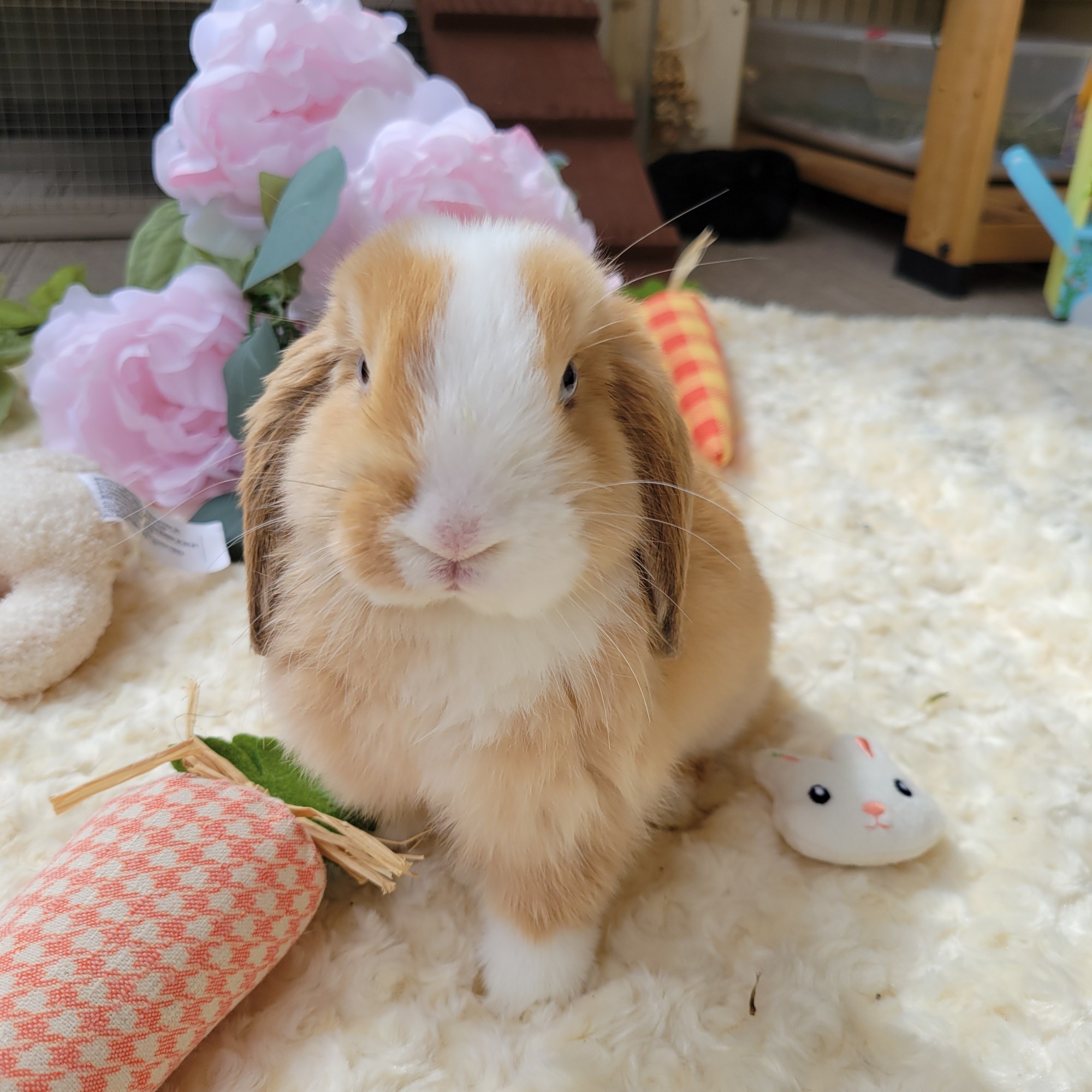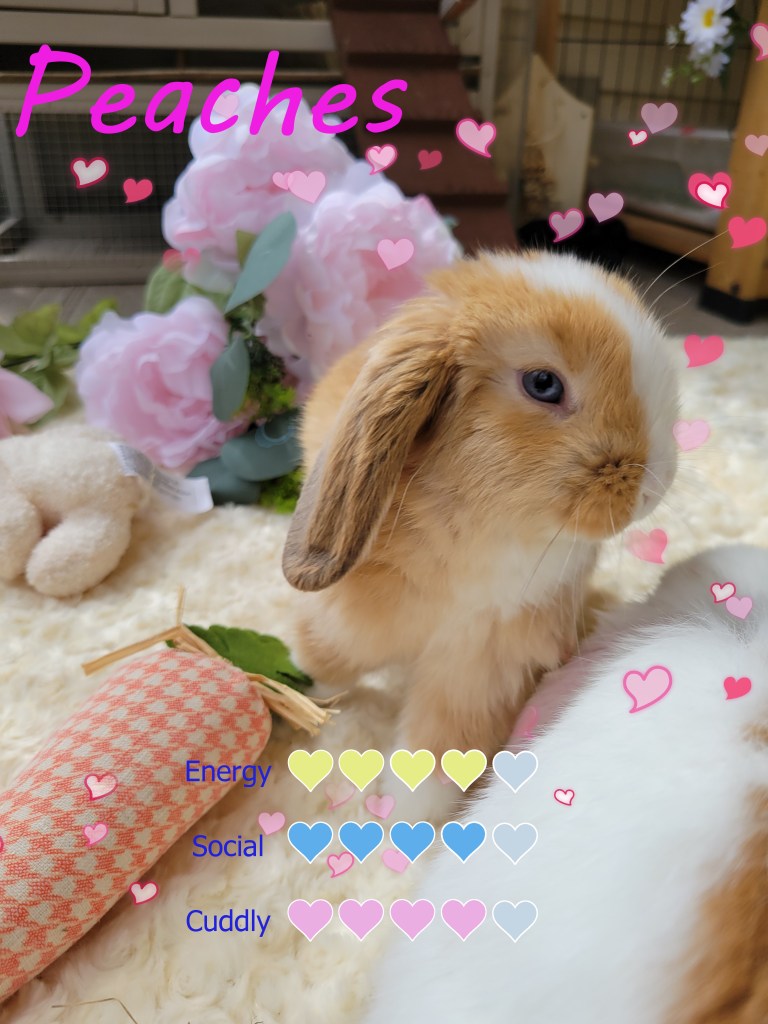 2-24-21: Peaches is such a sweet little cuddle bun. If your sitting on the ground she’ll jump right into your lap and take a nap there, and some soft pets will keep her there forever. She is a very easy going bun and down for a little cuddle time whenever you want, however she dislikes being cradled. She is very sweet to other buns and would a terrific addition to any family type.